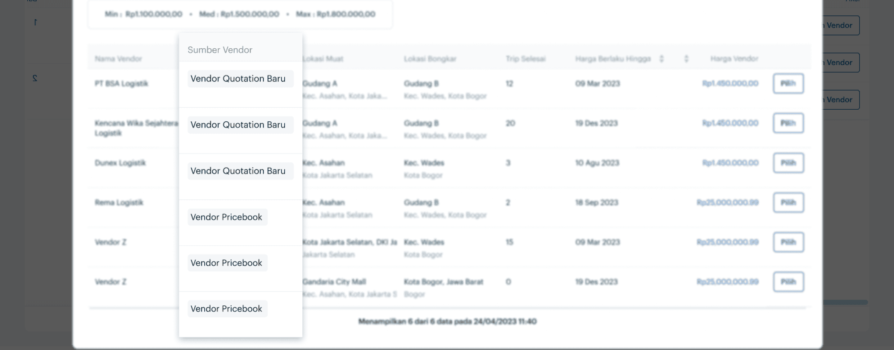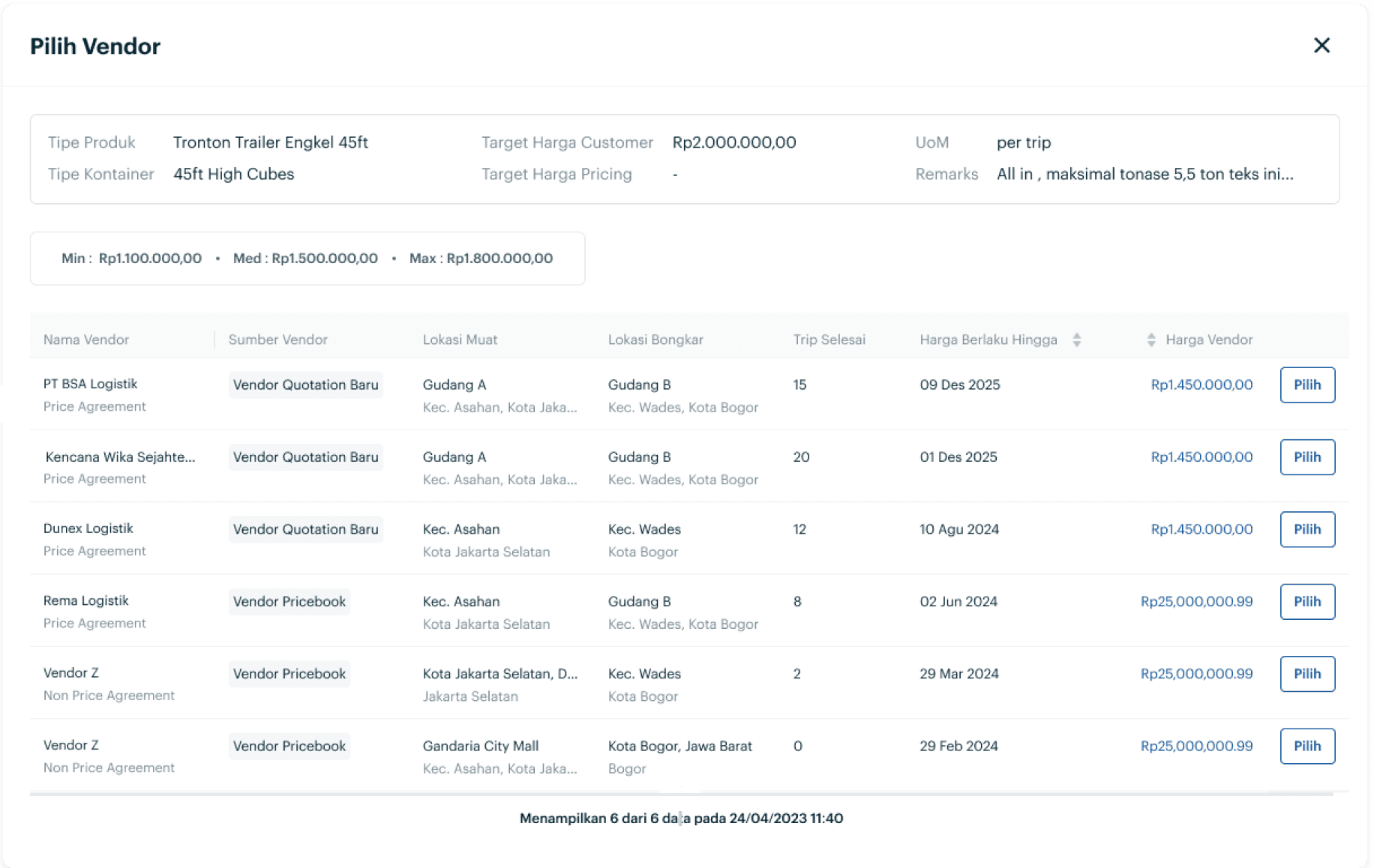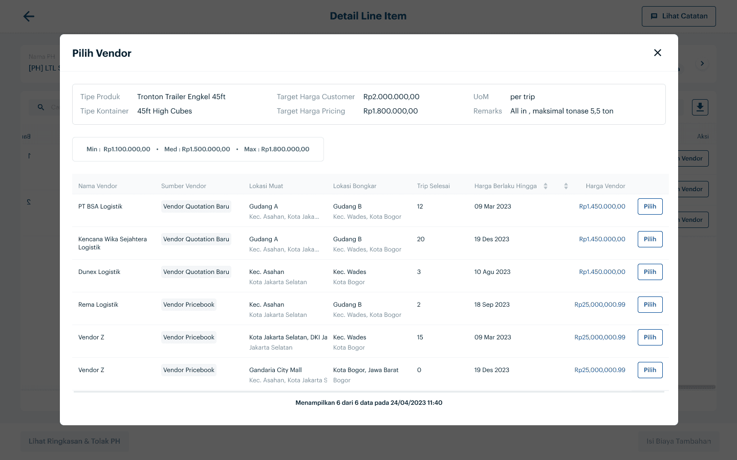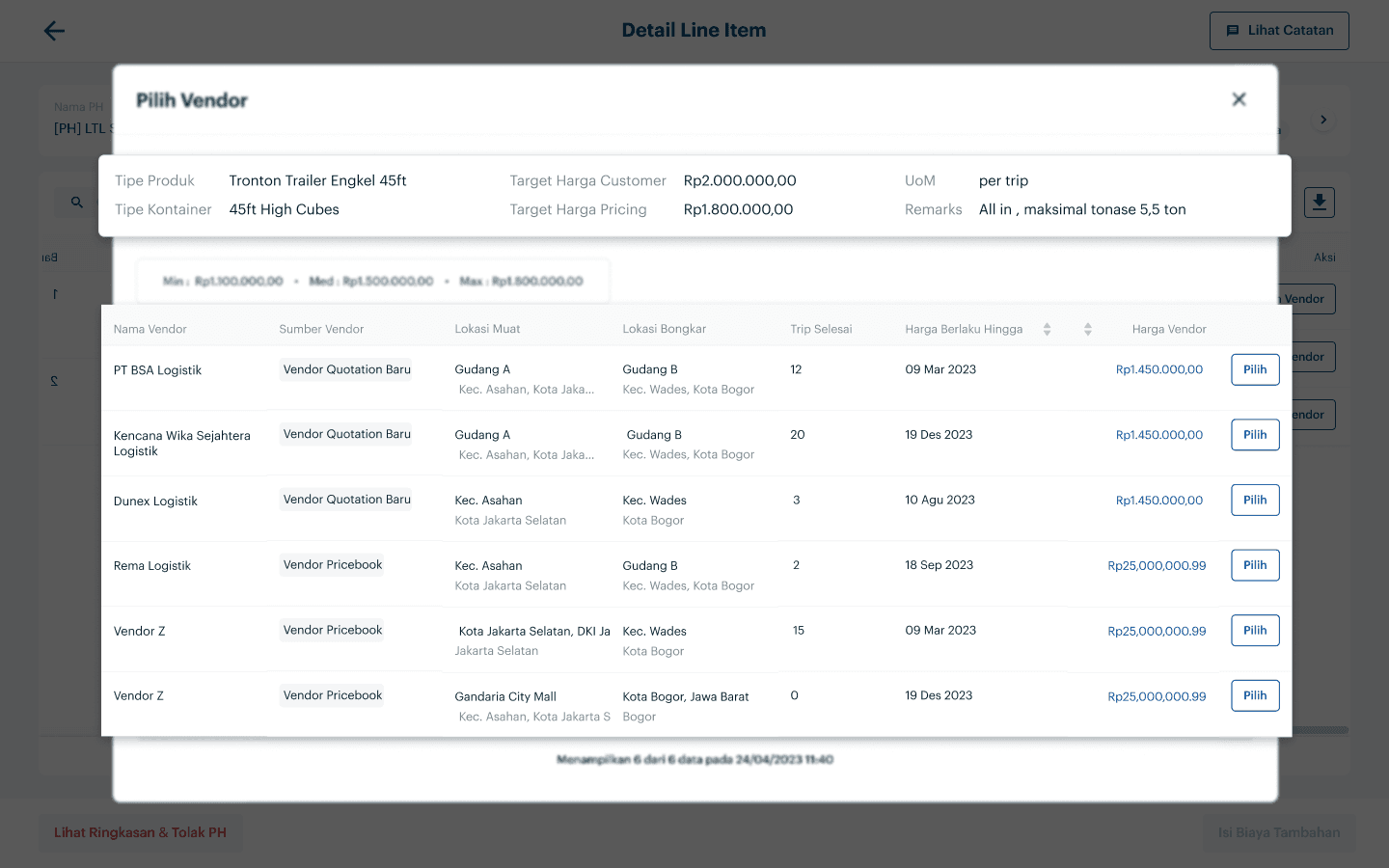 In the header section, the requested product information by the customer is displayed. In the table, specific information from each vendor is shown. This enables users to be more discerning in selecting the appropriate vendor for the customer. I also add 'Trip Selesai' column, which completed trip from vendor as a parameter for vendor quality.