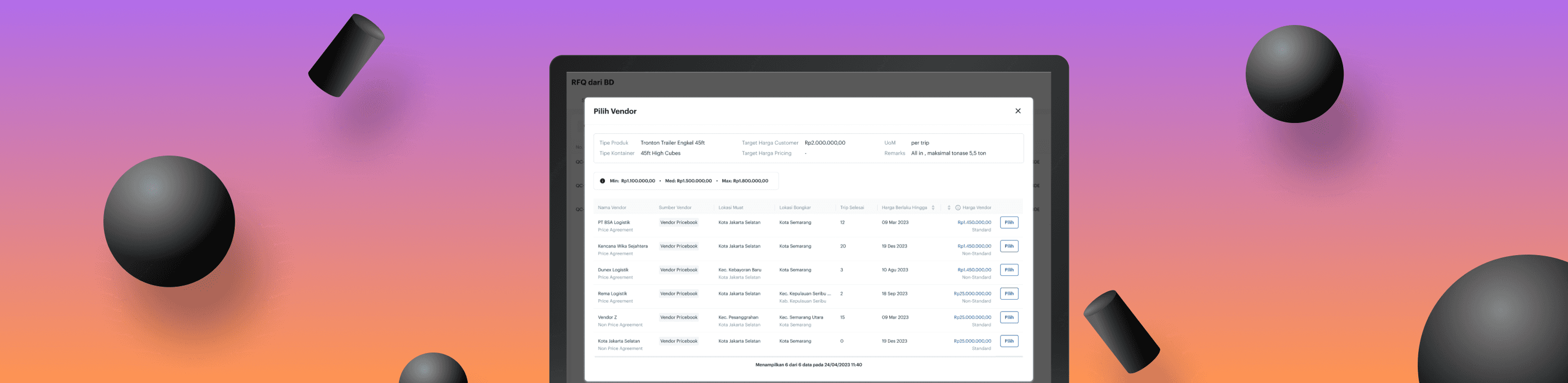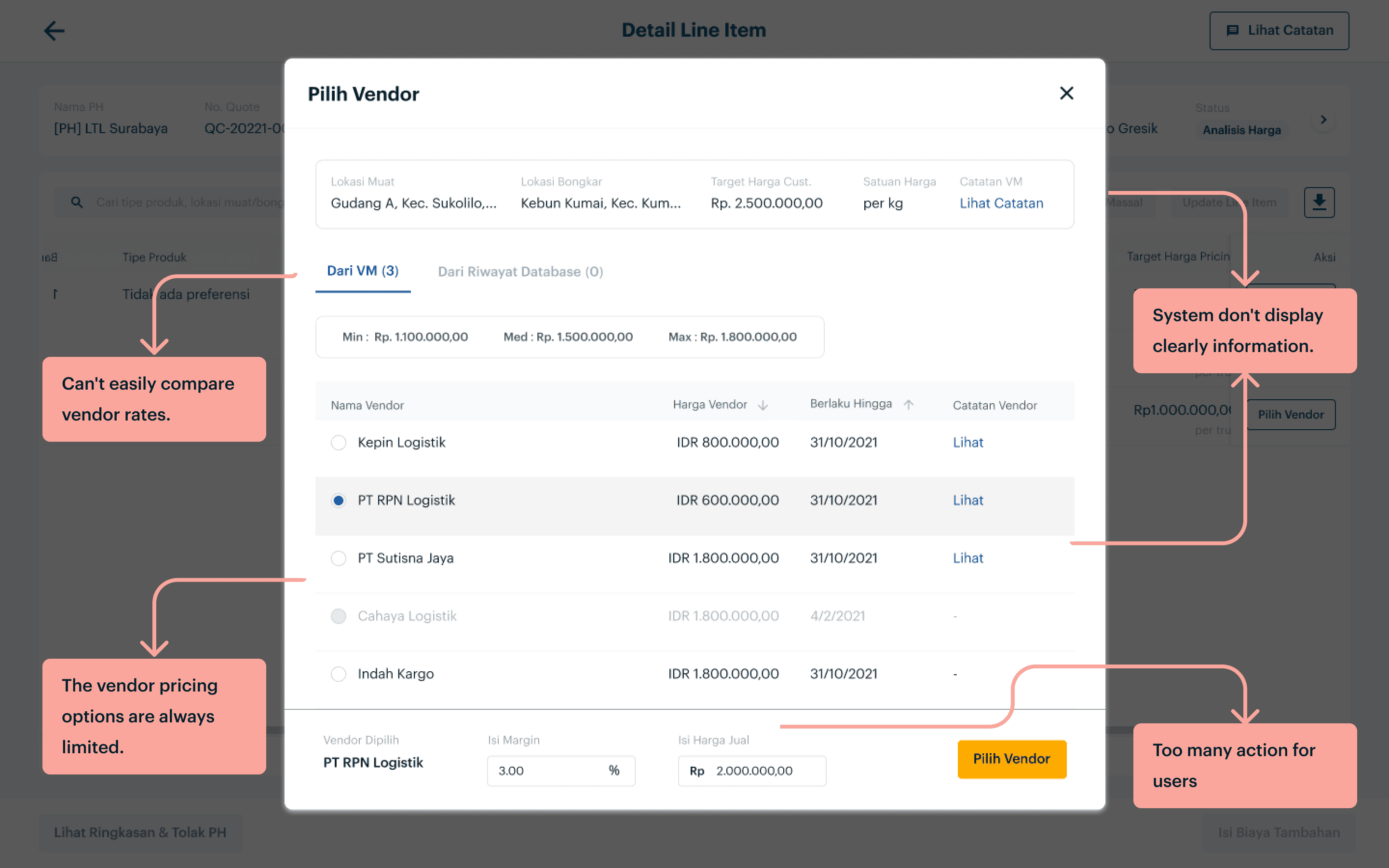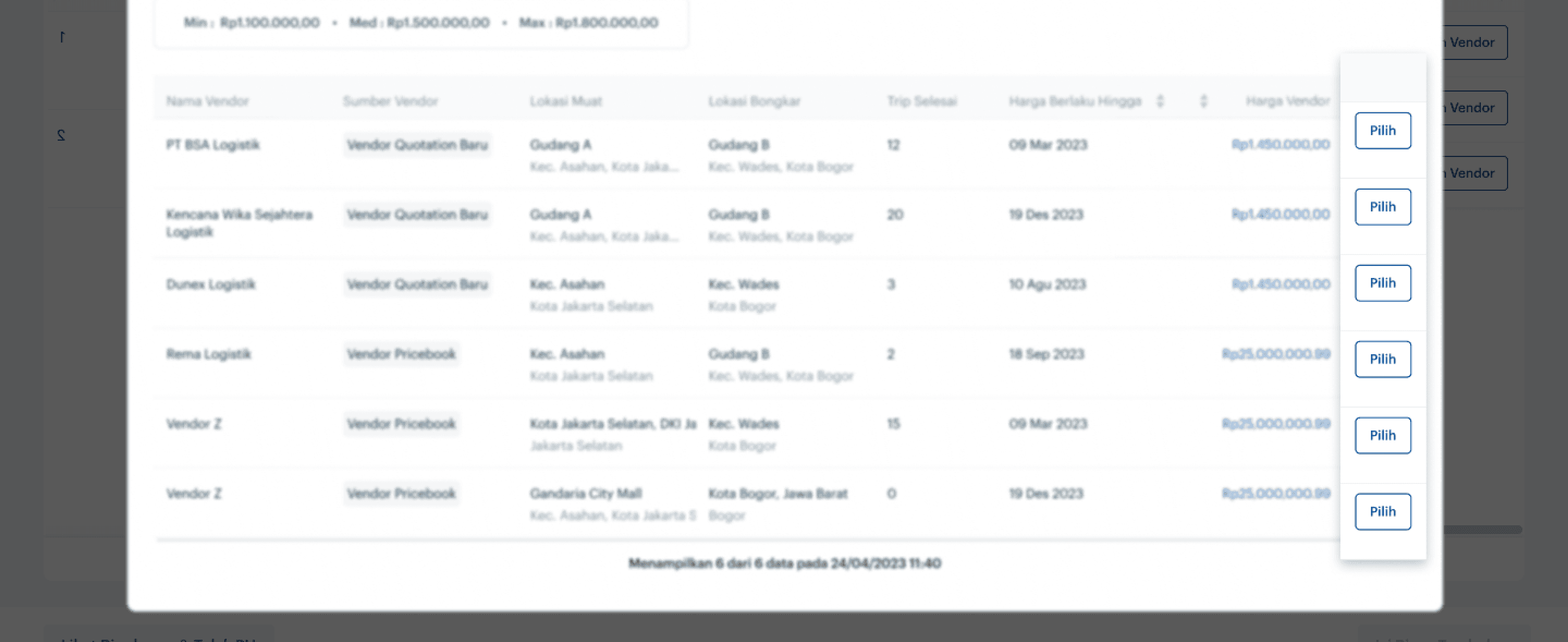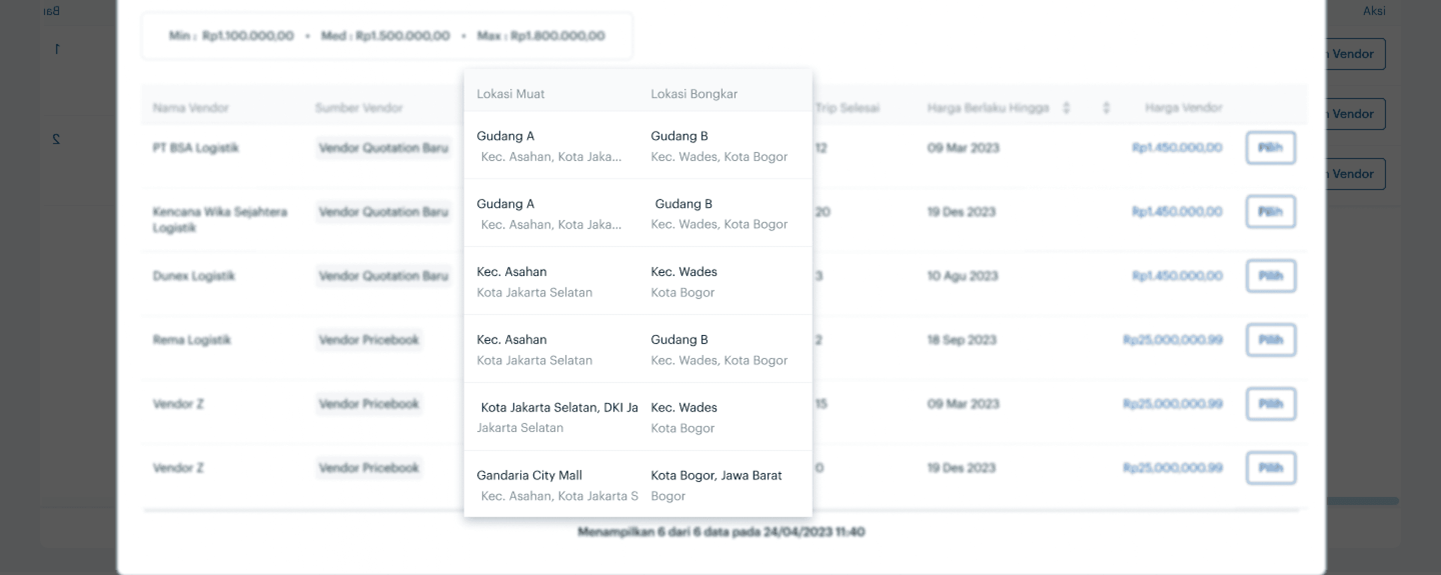 In the header section, the requested product information by the customer is displayed. In the table, specific information from each vendor is shown. This enables users to be more discerning in selecting the appropriate vendor for the customer. I also add 'Trip Selesai' column, which completed trip from vendor as a parameter for vendor quality.