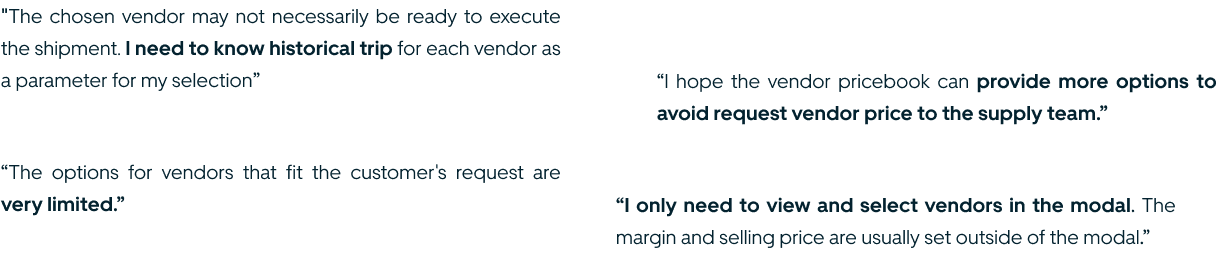 We decided to conduct design review with user due to the tight project timeline. The users are highly satisfied because with more vendor option from historical data, they have more flexibility in choosing a appropriate price without request to supply team. However, they still provide feedback on our proposed solution.