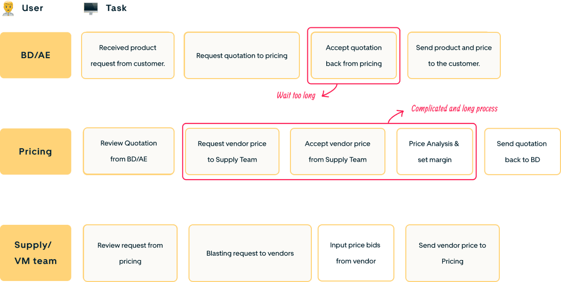 Based on the data we've collected. We've noticed that the process of providing quotation price for customers still slow, and not very appropriate for them. This has led customers to opt for other competitors as they receive more appropriate price and faster respons for their request. This made us assume that there is a problem with the price analysis process by pricing users.