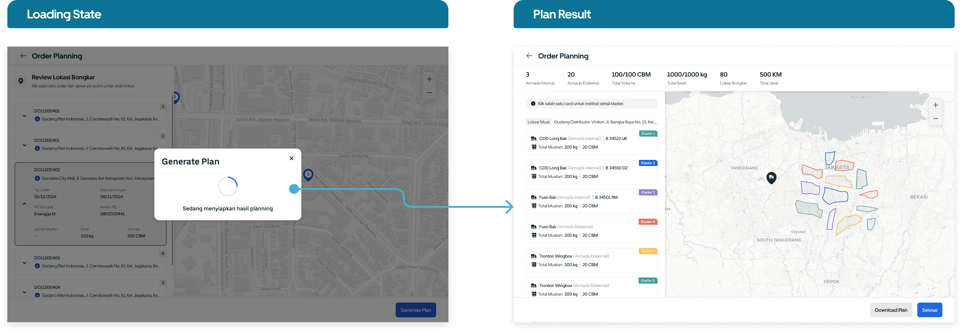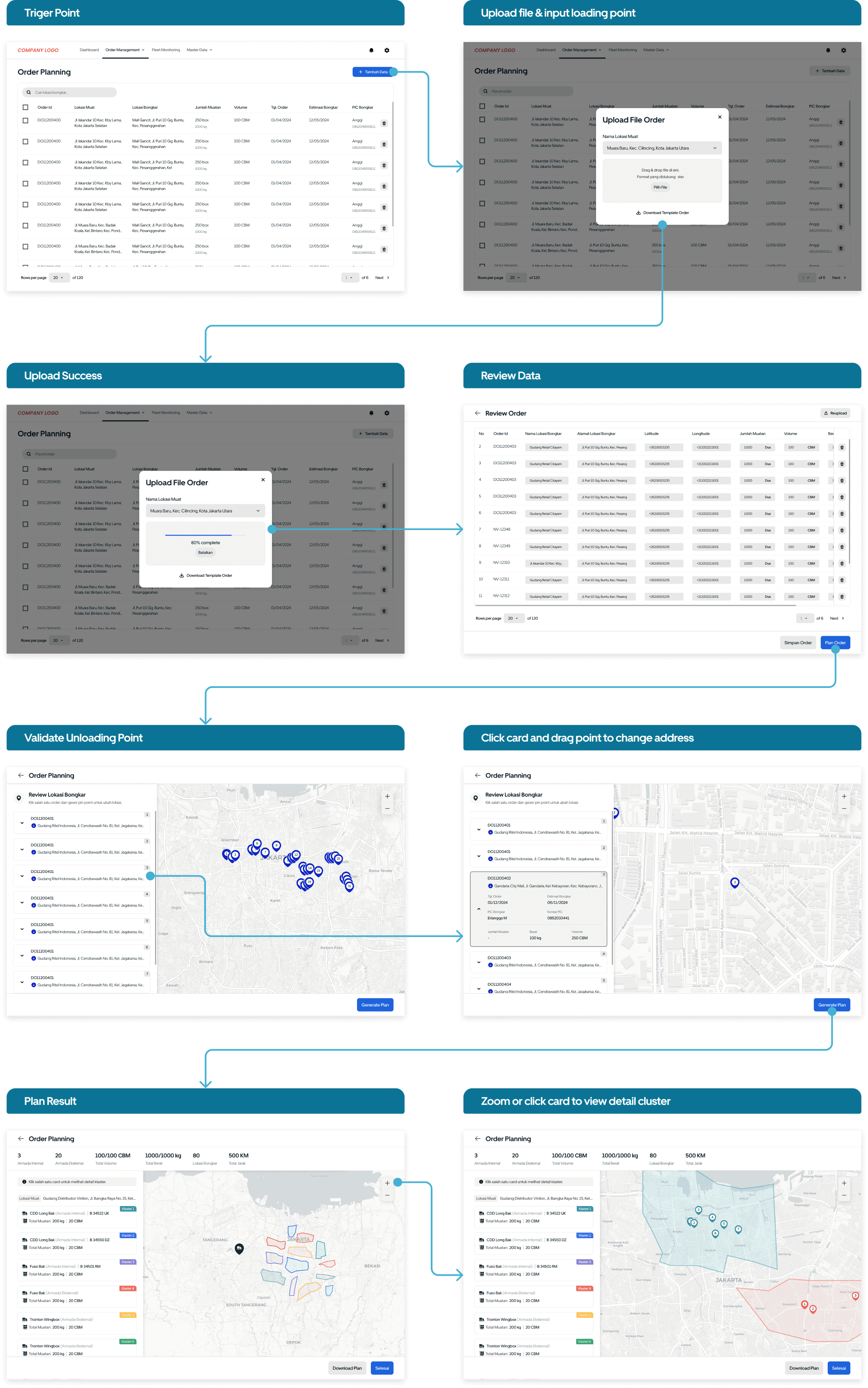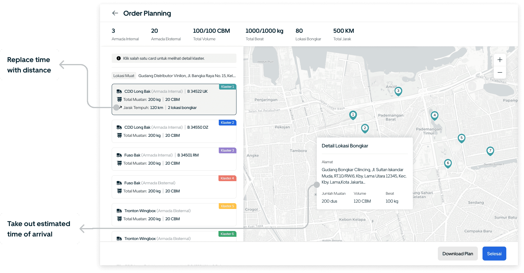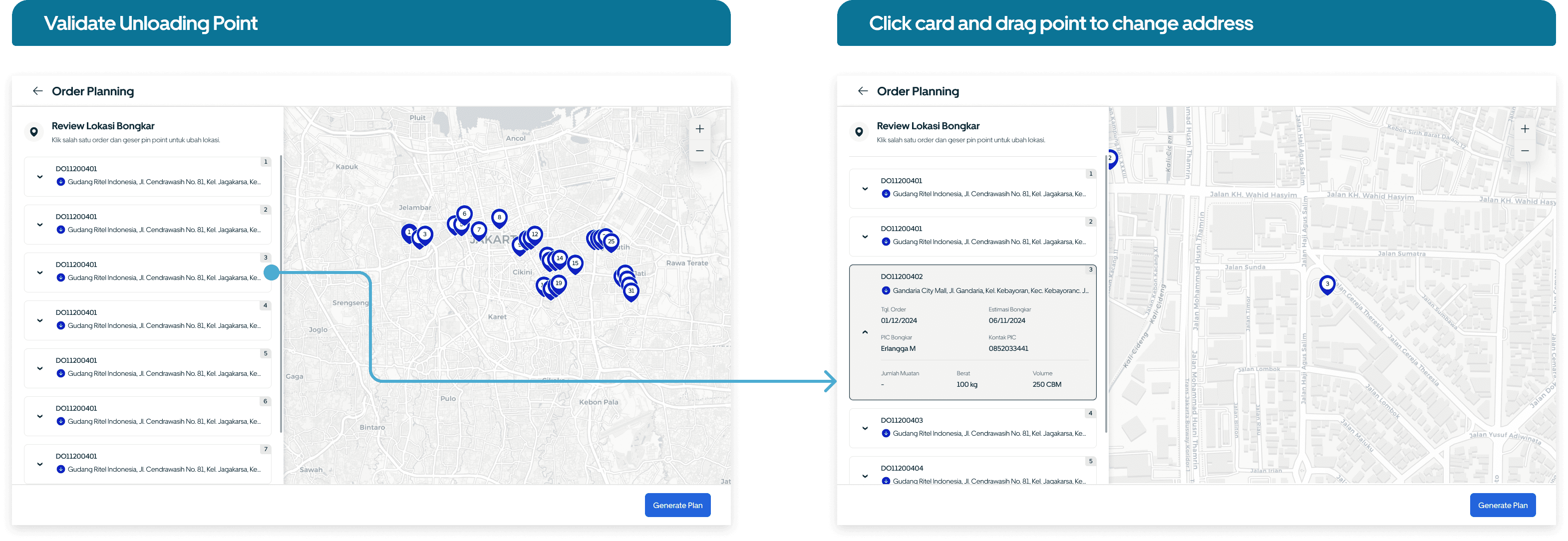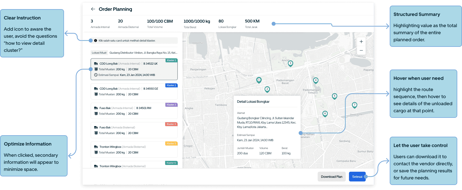 The user data formats are differents, some include coordinate data, while others don’t. This stage assists users who don’t have unloading point coordinate. Additionally, we make it easy for users to edit locations by simply drag and dropping, similar to what Google Maps does.